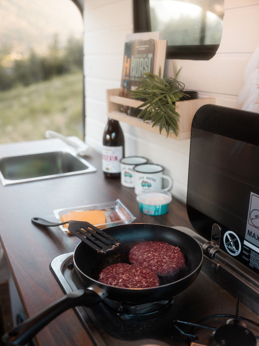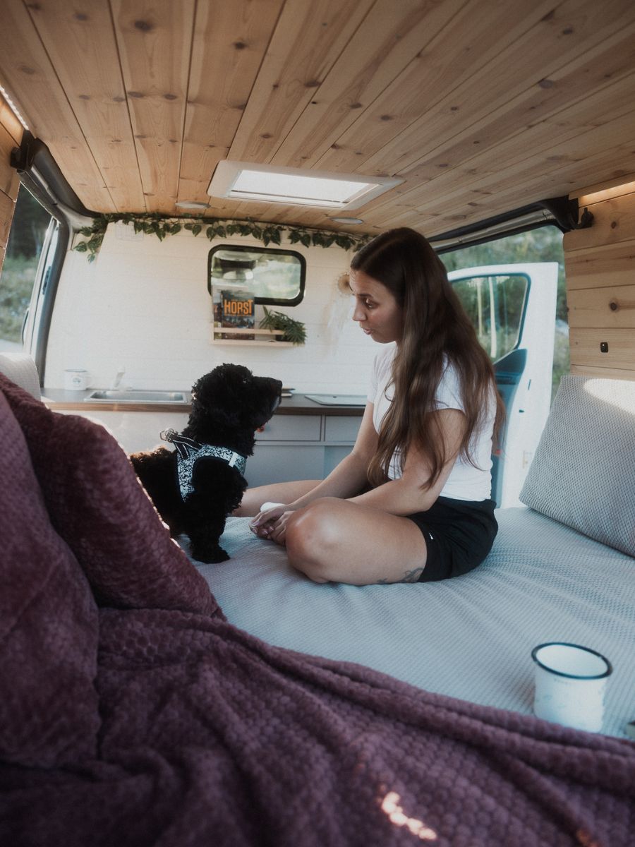Speaking of dinner, this campervan comes with an indoor kitchen with plenty of space in the cupboards. There is a double gas stove with 2 kg gas bottle. The kitchen is equipped with all the utensils you might need for camping cooking. There is a sink with running water, with a freshwater tank of 25 L. To keep your groceries cool, a compressor fridge can run during your whole trip thanks to a leisure battery.
